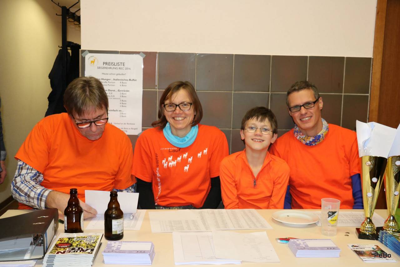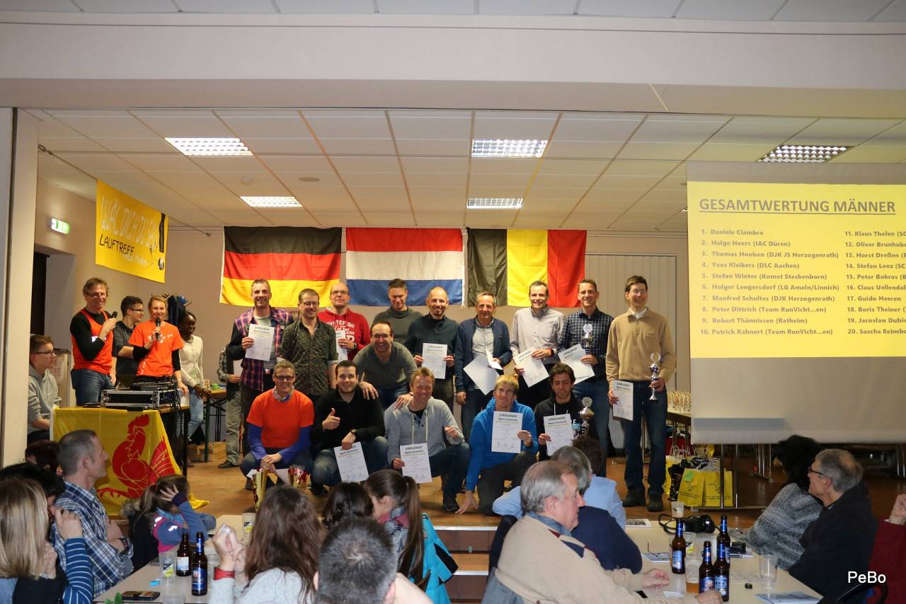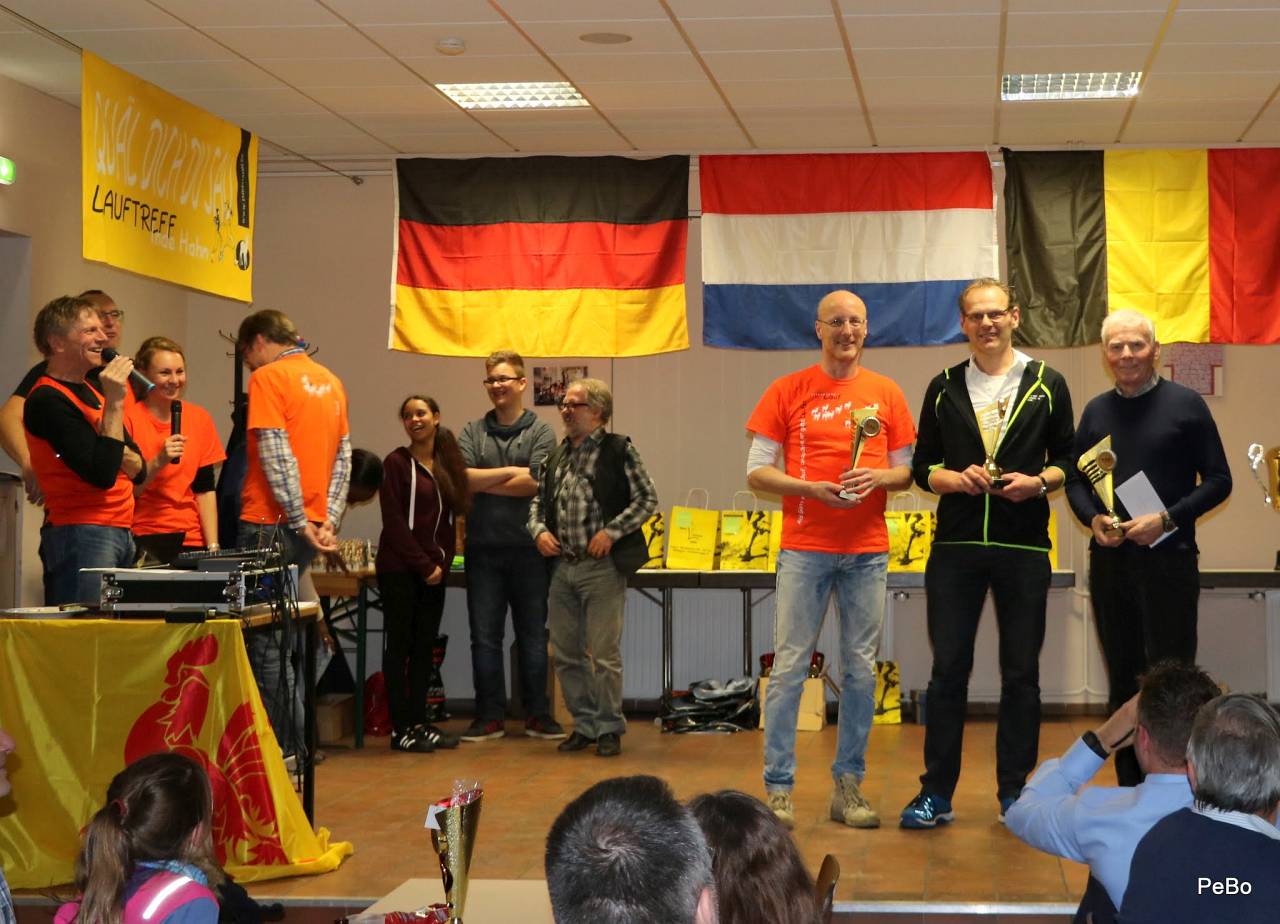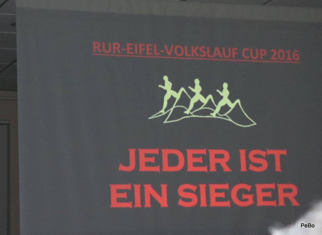 Am vergangenen Samstag hatte unser Lauftreff jede Menge Besuch in Hahn. Im Hahner Pfarrheim wurde die Siegerehrung des Rur-Eifel-Volkslauf-Cups 2016 gefeiert – erstmals organisiert durch unsere Laufabteilung. Die knapp 200 besten Läufer der Laufserie wurden an diesem Abend geehrt und mit den verdienten Pokalen und Urkunden und großem Applaus belohnt – mindestens 10 der insgesamt 38 REC-Läufe musste man dafür absolviert haben. Etwa 25 Helfer in den typischen orangen Shirts sorgten für den reibungslosen Ablauf und die beiden Moderatoren Andrea (alias Küken) und Dirk (alias Gute-Laune-Onkel) hielten die Gäste mit locker-flockigen Sprüchen bei Laune und unterstützten so Paul Boltersdorf, den Chef der beliebten Laufserie, die im letzten Jahr insgesamt 11000 Läufer zu ihren Veranstaltungen locken konnte. Wie immer bei solchen Gelegenheiten hatte Peter Borsdorff, der Läufer mit der Sammelbüchse, auch an diesem Abend seinen Auftritt – er berichtete über den aktuellen Gesamt-Spendenstand seiner Aktion „Running for kids“, der mittlerweile die 1,5-Millionen-Marke überschritten hat, und über die anstehenden Projekte, die wie immer bedürftigen Kindern zugute kommen werden. In der Pause sorgte eine junge Nachwuchssängerin für gute Stimmung, die schließlich sogar dazu führte, dass etliche der anwesenden Läufer einfach mitsangen. Am italienischen Buffet und an der Theke konnte man zwischendurch Hunger und Durst stillen, so dass die knapp vierstündige Veranstaltung allen Gästen riesengroßen Spaß bereitete. Die Lobhudelei wollte anschließend und auch an den folgenden Tagen kein Ende nehmen. Viele Gäste würden die Siegerehrung am liebsten auch im kommenden Jahr wieder in Hahn sehen – warum eigentlich nicht?