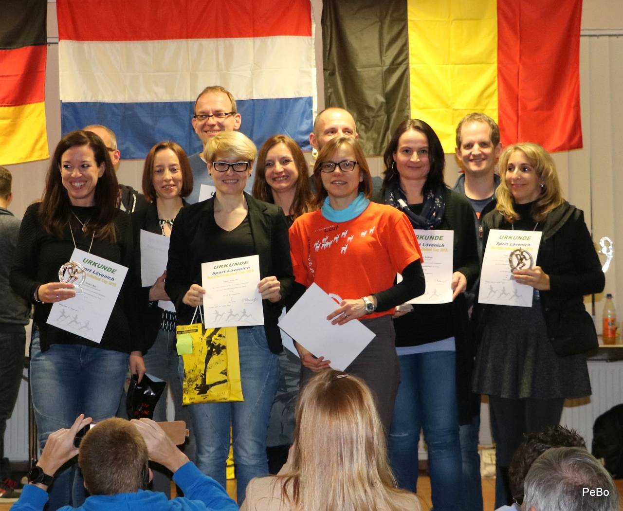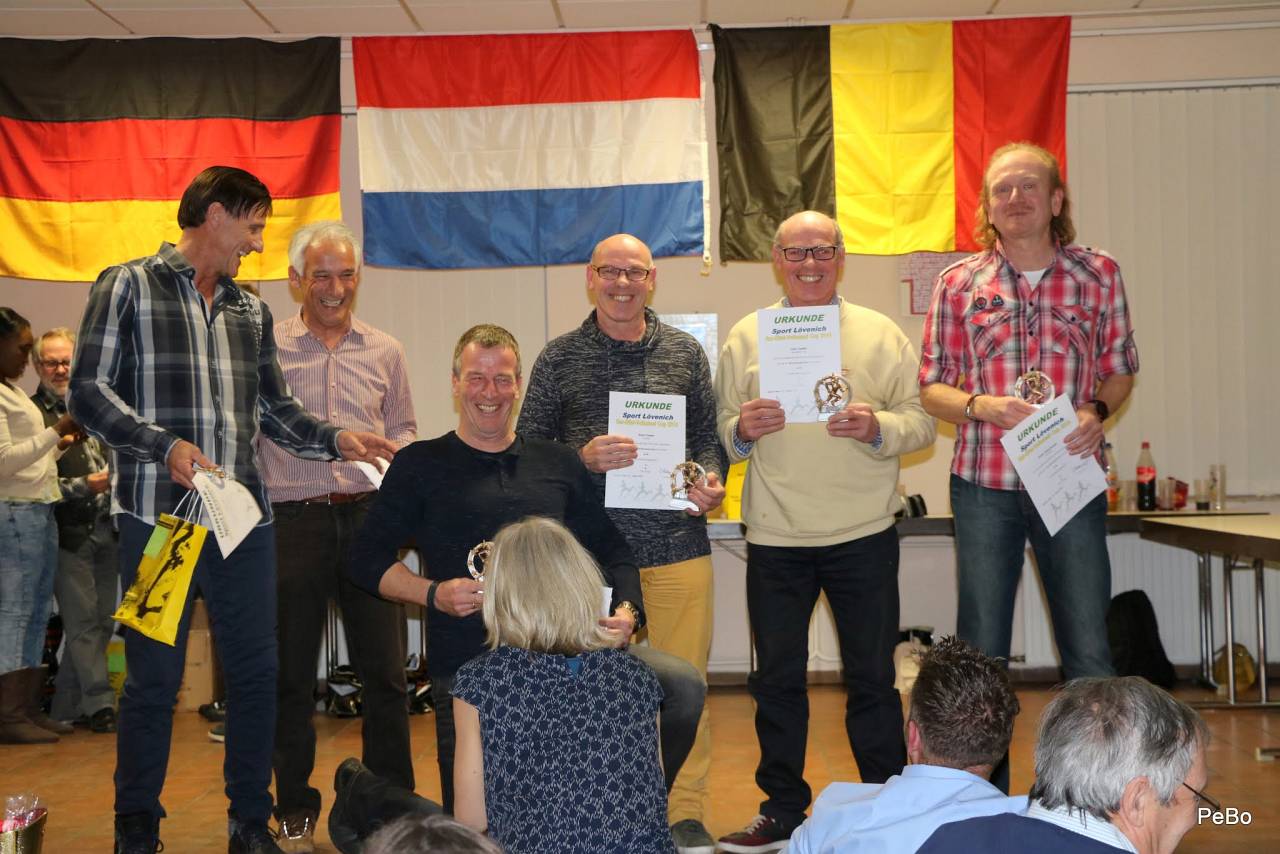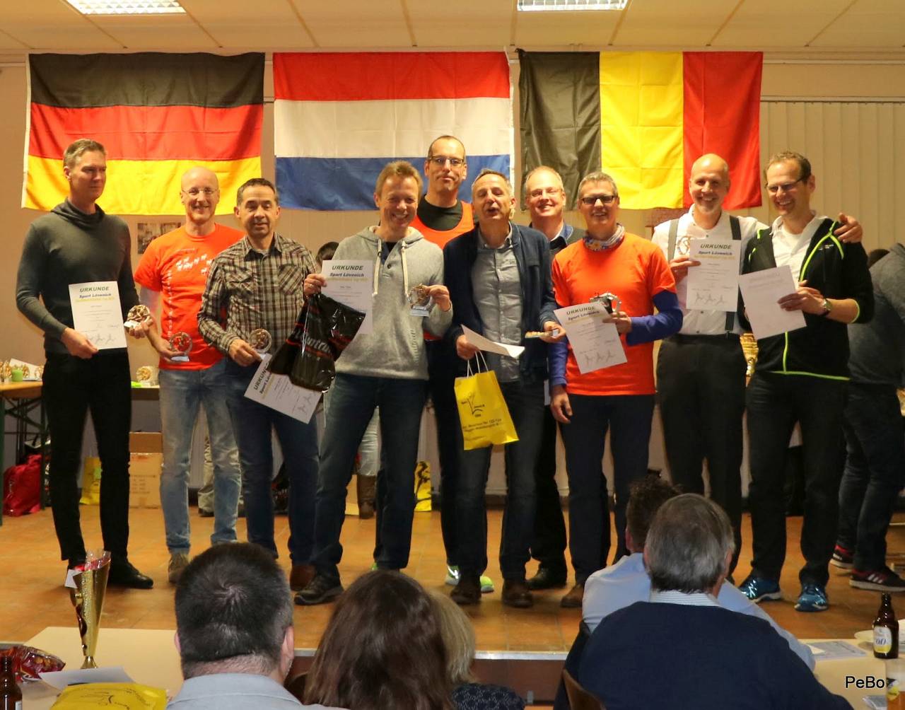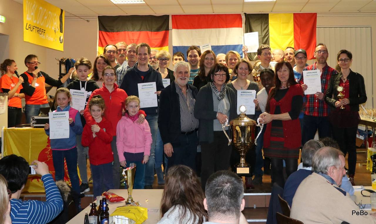 Natürlich wurden auch einige Hahner Läufer für ihre Leistungen im vergangenen Jahr geehrt – angeführt von Claus Uellendall, der es in der Gesamtwertung der Männer unter die Top 20 geschafft hatte. Anita Cerfontaine und Peter Koch waren in der Paarwertung erfolgreich und die komplette Familie Uellendall (Julius, Moritz, Bianka und Claus) bekam jeweils einen Pokal für ihre Altersklassen-Platzierungen – genau wie Manfred Plum und Norbert Kindel in der Altersklasse M50. Eine besonders positive Überraschung erlebte unsere Laufgruppe nach Stimmauszählung der Wahl zum schönsten Lauf des Jahres. Siegchancen durfte man sich angesichts der einzigartigen Stimmung beim Lichterlauf in Steckenborn (der der einzige Nachtlauf in der Wertung ist) nicht ausrechnen und so fühlte sich der zweite Platz für den Hahner Kitzenhauslauf wie ein Sieg an – eine tolle Bestätigung für die fleißige Arbeit, die wir alljährlich bei der Planung und Durchführung des Hahner Laufevents leisten.