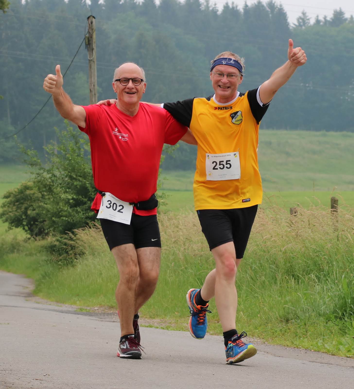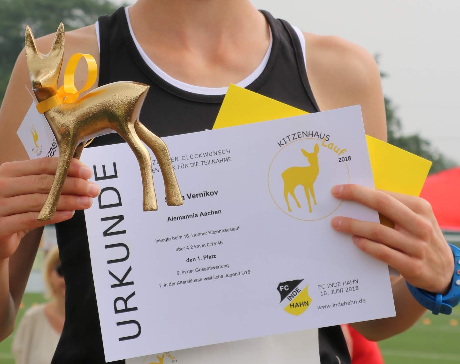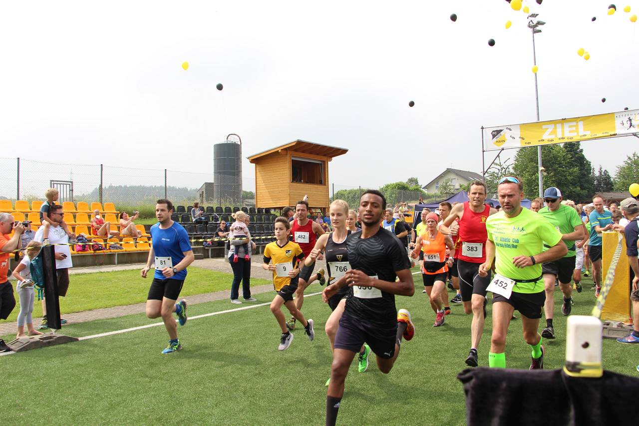 Es folgte das Warmup mit Uli und schließlich wurde um 12:12 Uhr der Hauptlauf über 10 km gestartet. Begleitet von aufsteigenden Ballons in den Vereinsfarben Gelb und Schwarz gingen wieder einmal fast 250 Läufer auf die wunderschöne Strecke, die teilweise über den Eifelsteig führt. Bei den Herren machten die Öcher am Ende die Podestplätze unter sich aus: es siegte in einer guten Zeit von 35:51 Lothar Wyrwoll von der Aachener TG vor seinem Vereinskollegen Achim Borgmann. Platz 3 belegte Semere Gebremkael von der Aachener Alemannia. Ebenfalls von der Alemannia kommt die Damen-Siegerin und ihren Namen kennen wir schon: nach anderthalb Stunden Pause siegte Sonja Vernikov auch im langen Lauf und machte mit einer Zeit von 40:39 ihren Doppelsieg perfekt – das hatte vor ihr zuletzt Tobias Hibbe im Jahr 2015 geschafft. Anna Dohmen (ATG) musste sich knapp geschlagen geben, Christiane Kruse (Skikeller Kaulard & Schroiff) belegte Platz 3 der Damenwertung. Der FC Inde Hahn durfte sich immerhin über die beiden Altersklassensiege unserer Nachwuchs-Talente Lukas Gier und Simon Offermann freuen.