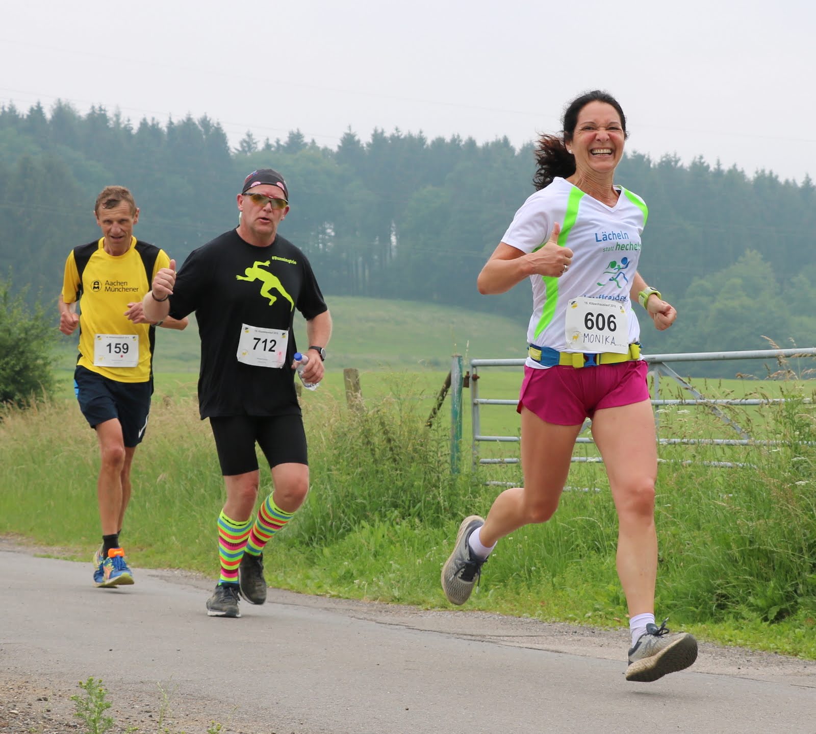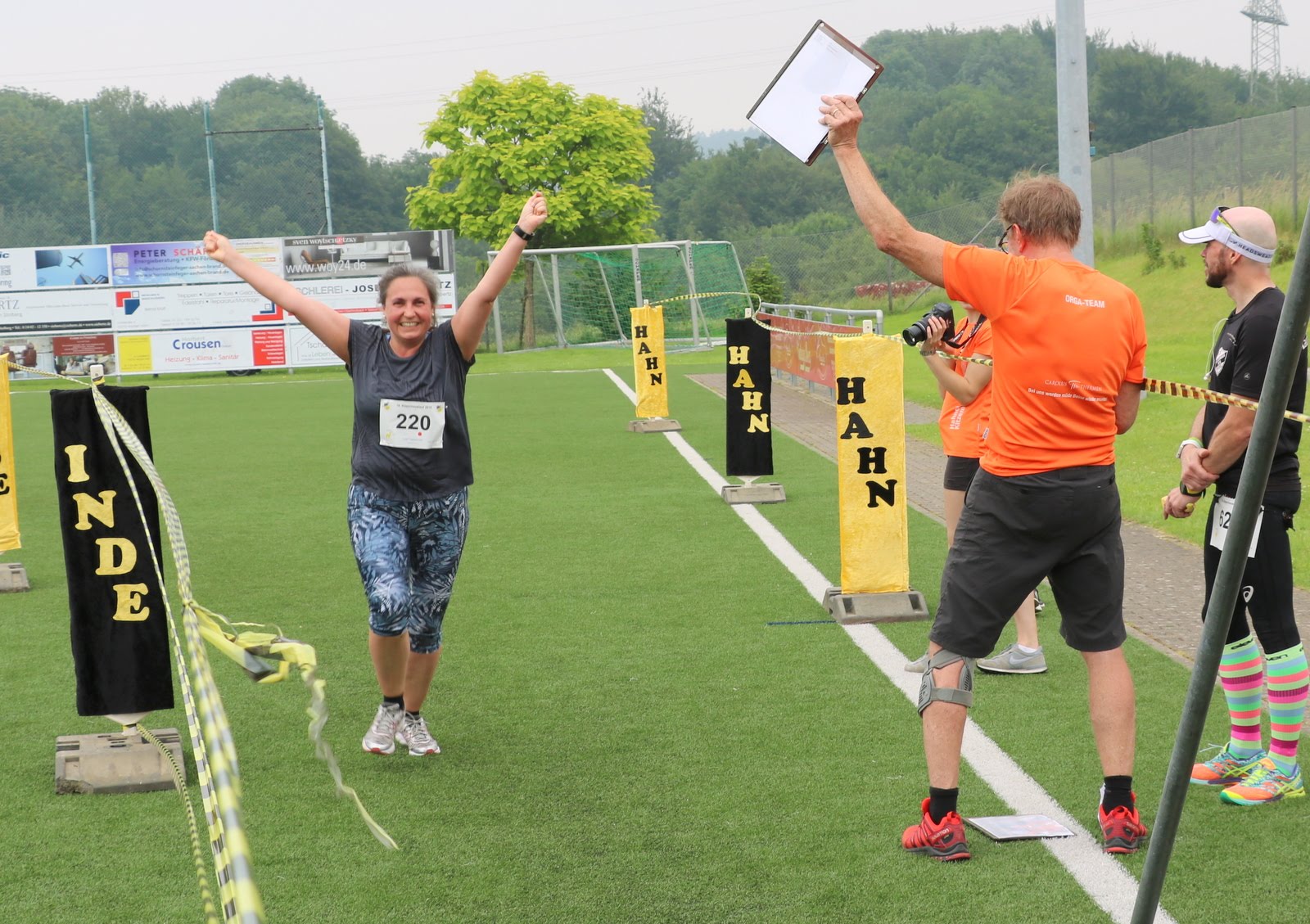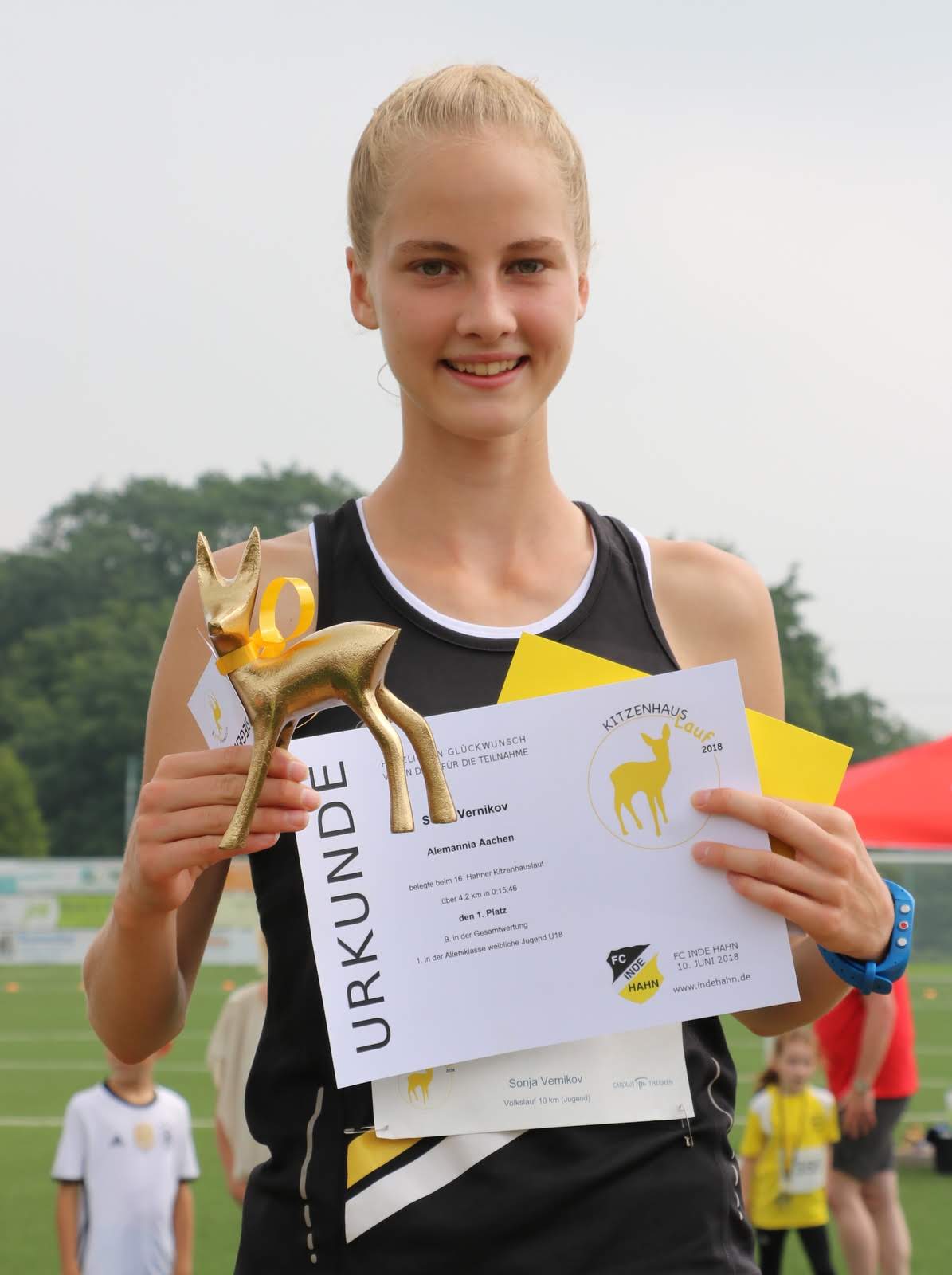 Es folgte das Warmup mit Uli und schließlich wurde um 12:12 Uhr der Hauptlauf über 10 km gestartet. Begleitet von aufsteigenden Ballons in den Vereinsfarben Gelb und Schwarz gingen wieder einmal fast 250 Läufer auf die wunderschöne Strecke, die teilweise über den Eifelsteig führt. Bei den Herren machten die Öcher am Ende die Podestplätze unter sich aus: es siegte in einer guten Zeit von 35:51 Lothar Wyrwoll von der Aachener TG vor seinem Vereinskollegen Achim Borgmann. Platz 3 belegte Semere Gebremkael von der Aachener Alemannia. Ebenfalls von der Alemannia kommt die Damen-Siegerin und ihren Namen kennen wir schon: nach anderthalb Stunden Pause siegte Sonja Vernikov auch im langen Lauf und machte mit einer Zeit von 40:39 ihren Doppelsieg perfekt – das hatte vor ihr zuletzt Tobias Hibbe im Jahr 2015 geschafft. Anna Dohmen (ATG) musste sich knapp geschlagen geben, Christiane Kruse (Skikeller Kaulard & Schroiff) belegte Platz 3 der Damenwertung. Der FC Inde Hahn durfte sich immerhin über die beiden Altersklassensiege unserer Nachwuchs-Talente Lukas Gier und Simon Offermann freuen.