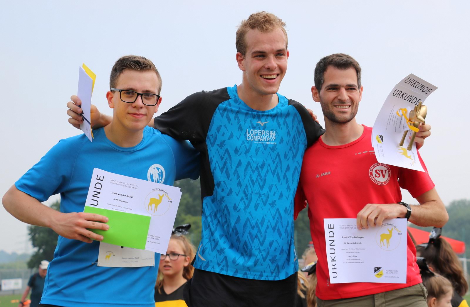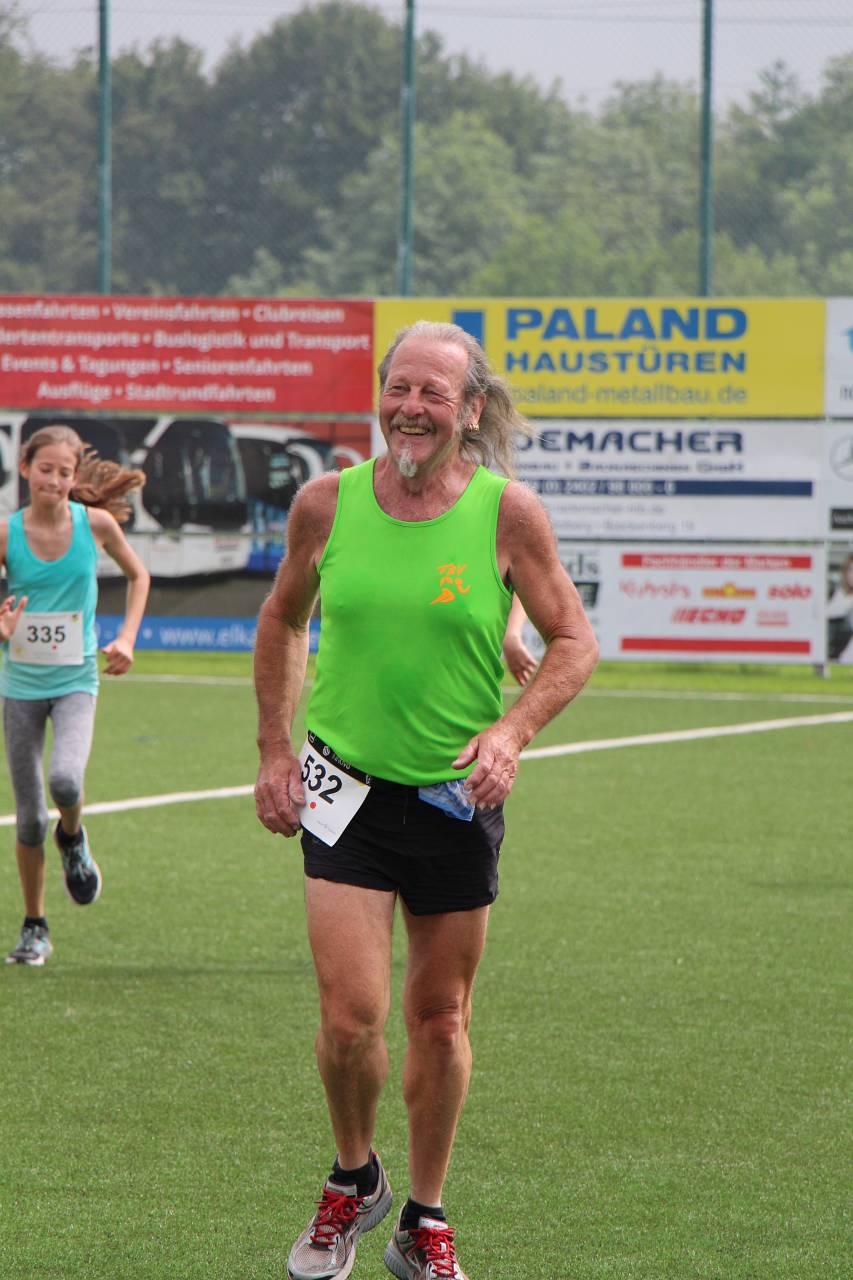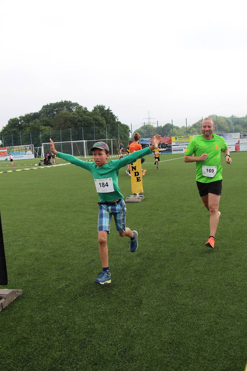 Wie immer machten die 4,2-km-Läufer den Anfang. Von Jahrgang 1928 (!!!) bis Jahrgang 2008 waren alle Altersklassen vertreten – bei unserem kurzen Volkslauf messen sich gerne die Kleinen mit den Großen. Mit 195 Läufern kamen so viele wie nie auf dieser Strecke ins Ziel (Finisher nennt man das in Fachkreisen gerne) und am Ende durfte man sich über einen fantastischen Streckenrekord freuen. Bereits zum vierten Mal trug sich Jorrit van der Raadt (STAP Brunssum) in die Siegerliste ein und er verbesserte seine eigene Strecken-Bestmarke von 13:51 um unglaubliche 42 Sekunden auf 13:09. Bei der Anzahl der Siege zog er damit mit Tobias Hibbe gleich, der diesen Lauf ebenfalls viermal gewinnen konnte. Es wird sicher schwer, diese Leistung im kommenden Jahr noch einmal zu toppen, doch wie wir Jorrit kennen wird er es definitiv wieder versuchen. Natürlich hatte er im Ziel einen größeren Vorsprung, so dass es fast 90 Sekunden dauerte bis Patrick Vonderhagen (SV Germania Dürwiss) ihm über die Ziellinie folgte. Platz 3 belegte Jorrits „kleiner“ Bruder Jesse van der Raadt (STAP Brunssum) mit einer Zeit von 15:11. Nur wenig später erreichte auch die schnellste Dame das Ziel: die 16-jährige Sonja Vernikov (Alemannia Aachen) wiederholte ihren Sieg von 2016 und verpasste mit ihrer Zeit von 15:46 den im vergangenen von Claudia Valdiz aufgestellten Streckenrekord nur hauchdünn – bei ihrer aktuellen Entwicklung darf man hoffen, dass sie im kommenden Jahr richtig auf Rekordjagd gehen wird. Platz 2 der Damenwertung belegte Sarah Kirner (DJK Jung Siegfried Herzogenrath) vor Annika Niederau (Raspo Brand). Schnellster Hahner Läufer war Mika Olbertz mit einer Zeit von 19:37.