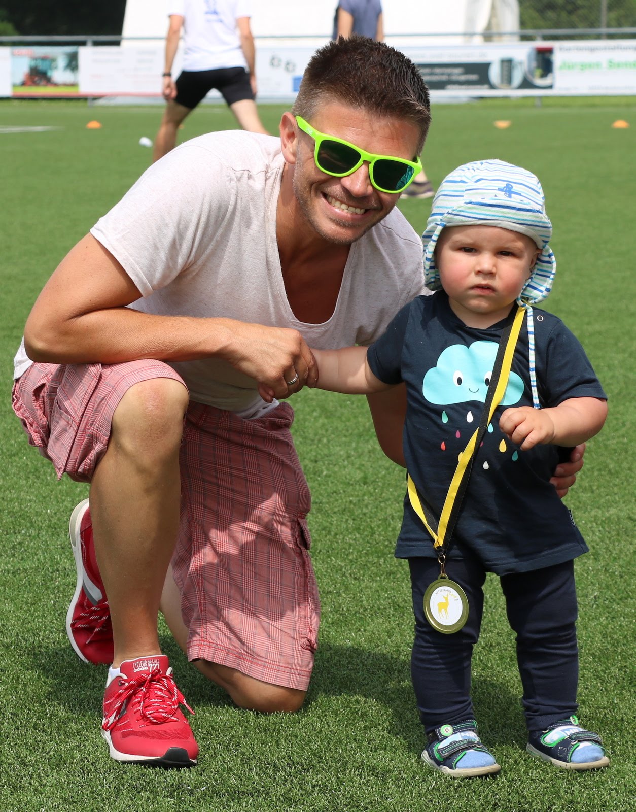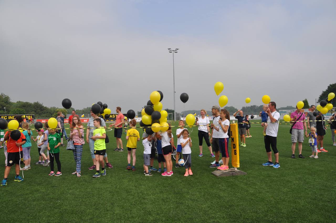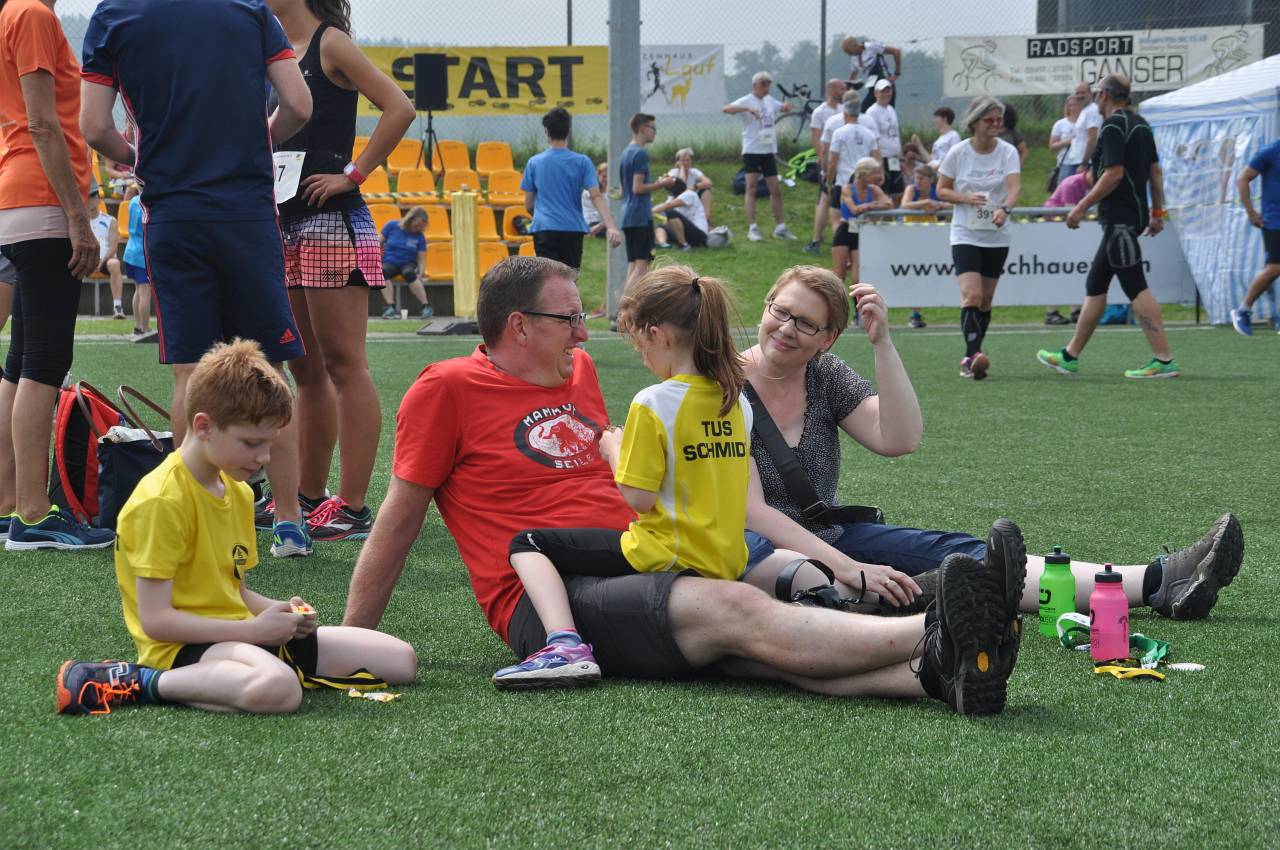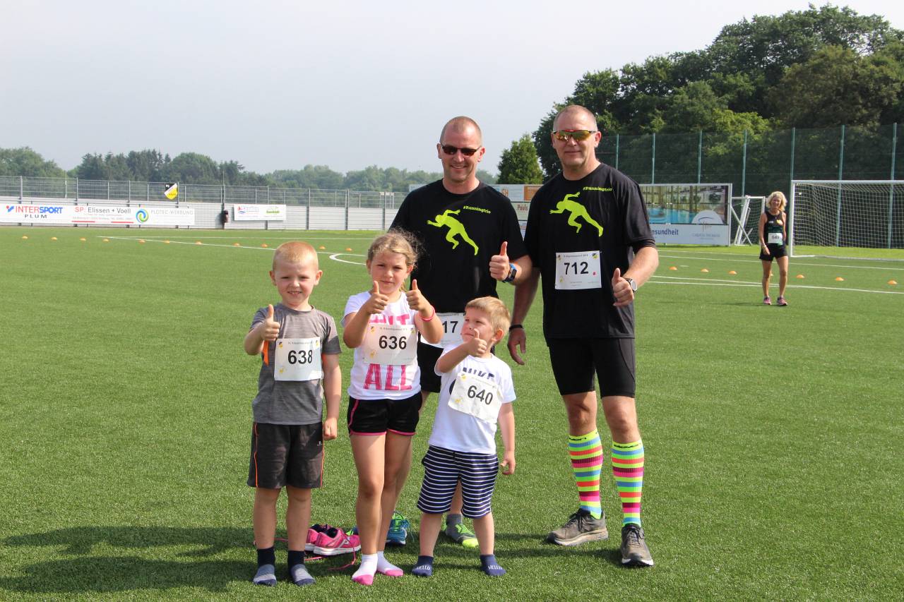 Beim anschließenden Bambinilauf wurden wie üblich keine Zeiten genommen – hier zählen nicht die Platzierungen, sondern ganz allein die „B-Note“, die sich aus ganz viel Spaß und ein wenig Durchhaltevermögen zusammensetzt. Während die größeren Bambini dem vorauslaufenden Hasen wie üblich dicht auf den Fersen waren, wurden die kleineren (teilweise nicht einmal zwei Jahre alten) Kinder auf der Stadionrunde von ihren Eltern begleitet. Wenn schließlich am Ende die Medaille um den Hals baumelt und eine kleine süße Stärkung im Ziel vertilgt ist, dann schauen die Kids einfach nur noch glücklich drein und von der vorherigen Anstrengung sieht man keine Spur mehr.