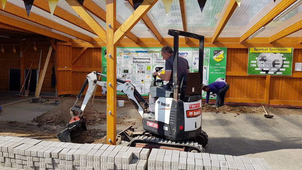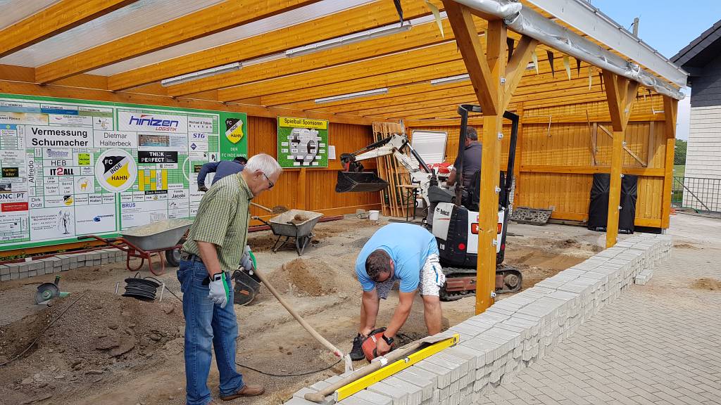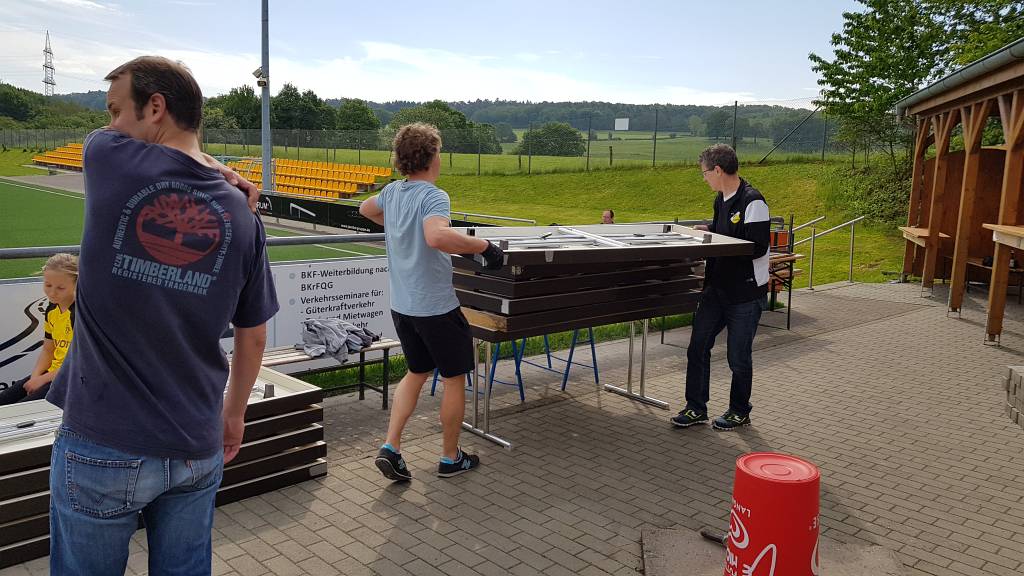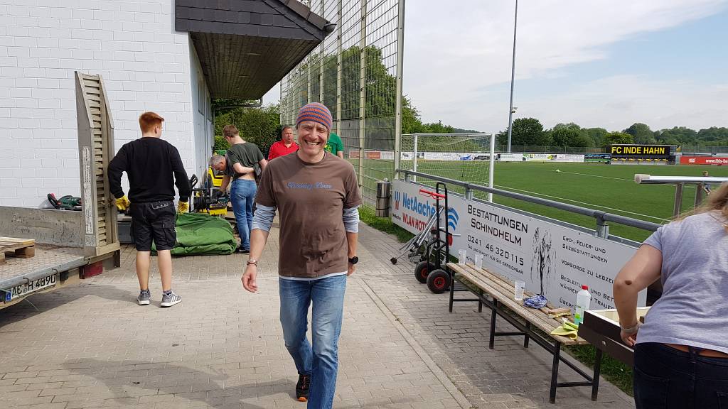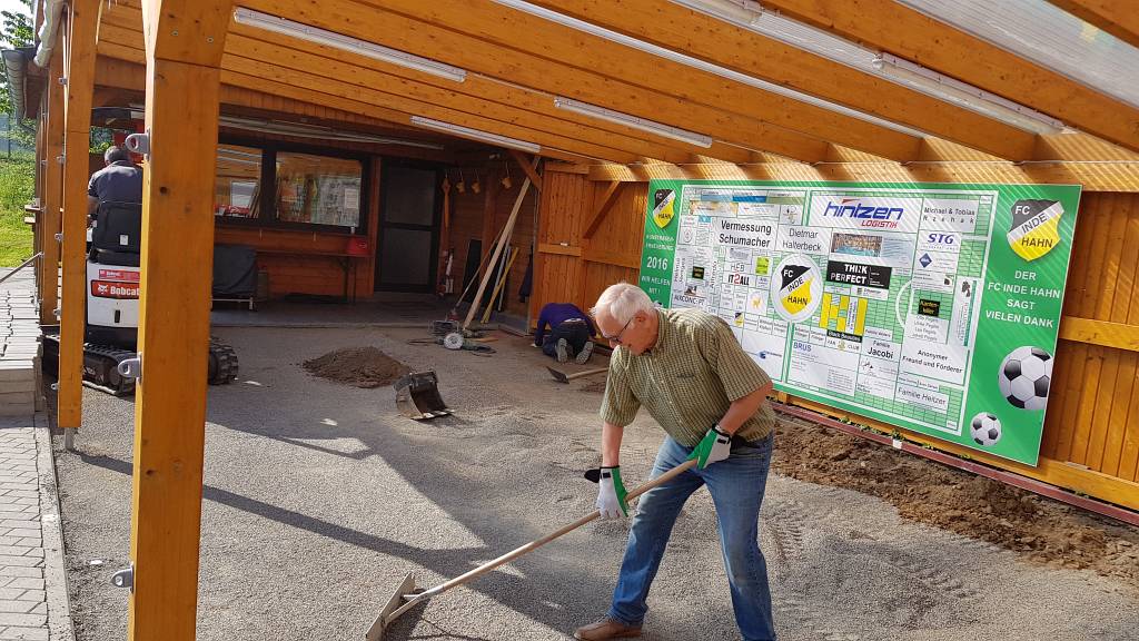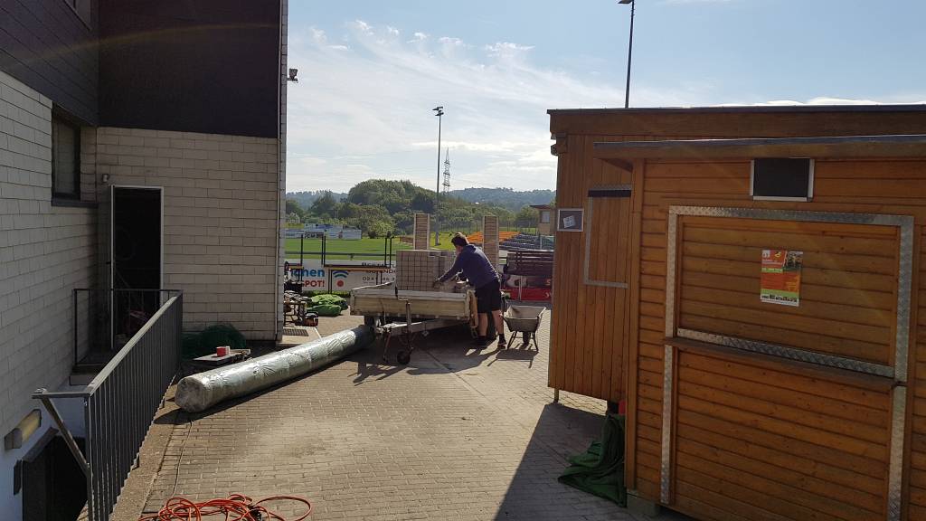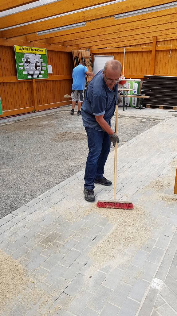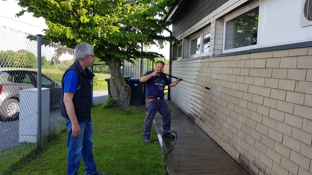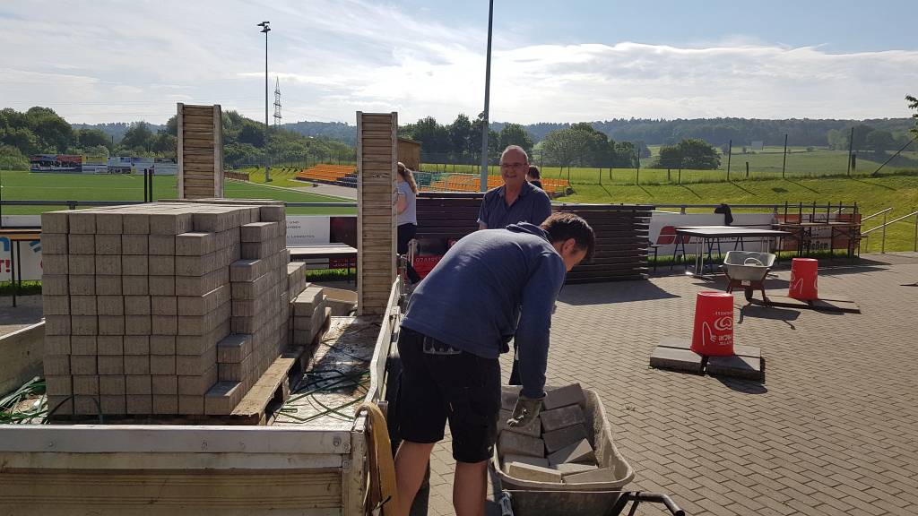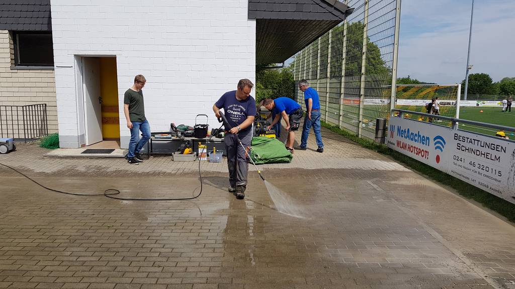 Am deutlichsten sichtbar sind die Änderungen im Bereich der Boulebahn, die um ein paar Quadratmeter verkleinert wurde, um dadurch die gepflasterte Fläche zu erweitern und Stolperfallen zu beseitigen. In diesem Bereich wurde einiges an Erde und Pflastersteinen bewegt. Das war aber nur eine der zahlreichen Verbesserungen und Aufräumaktionen – hier sind weitere Beispiele von der Auftragsliste, die am Samstag erledigt wurden: Zaun nachspannen und Löcher schließen, Sitzschalen reinigen und reparieren, herausgebrochene Stäbe im Fangzaun beseitigen, Neu-Ausrichtung der WebCams und Befestigung der Kabel, Altmetall und sonstigen Abfall einsammeln und abtransportieren, neue Mülleimer, neue schwarz/gelbe Tornetze, Anstrich- und Ausbesserungsarbeiten an der Sprecherkabine, Geländer befestigen, Gebäudeverkleidung und Pflastersteine mit Dampfstrahler grundreinigen, neue Abdeckung für die Boulebahn, alte Tische entsorgen, neue Tische grundreinigen und ins Vereinsheim bringen … und noch so einiges mehr. Werkzeug und Material war ausreichend vorhanden, helfende Hände ebenfalls und gute Laune sowieso. Die Damen vom Büdchen verwöhnten die Helfer gegen Mittag mit einer leckeren Mahlzeit und natürlich zwischendurch immer wieder mit Kaltgetränken. Auch das Wetter spielte hervorragend mit, so dass man in allen Bereichen gut voran kam.