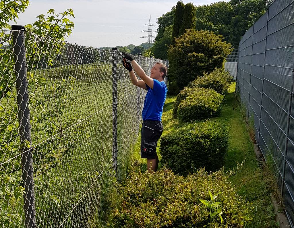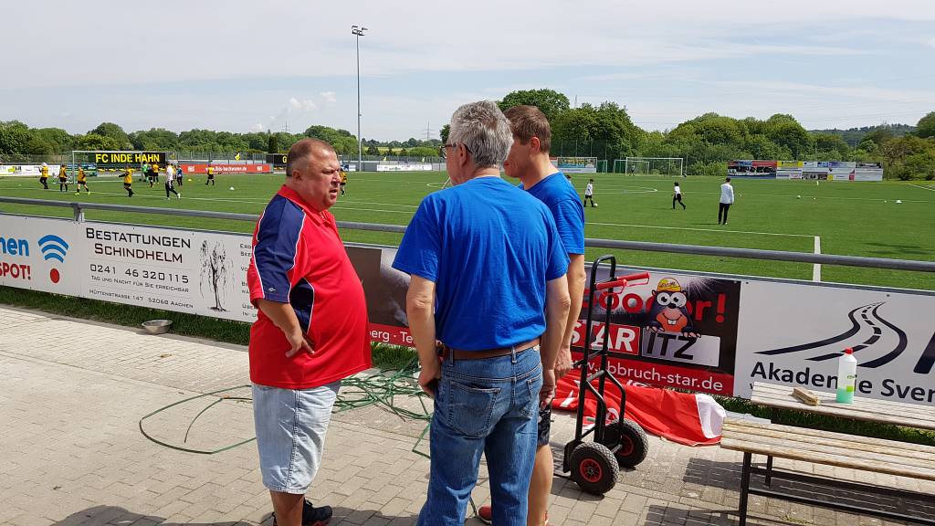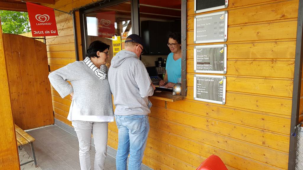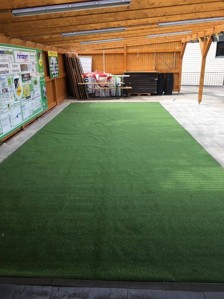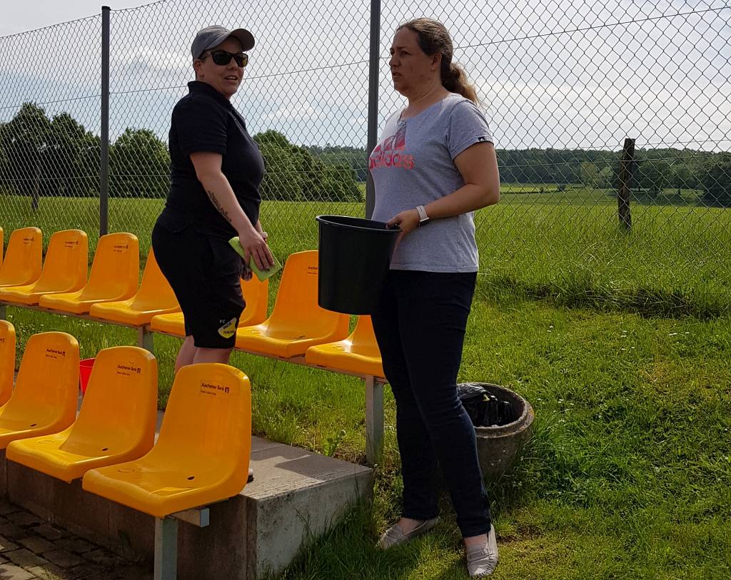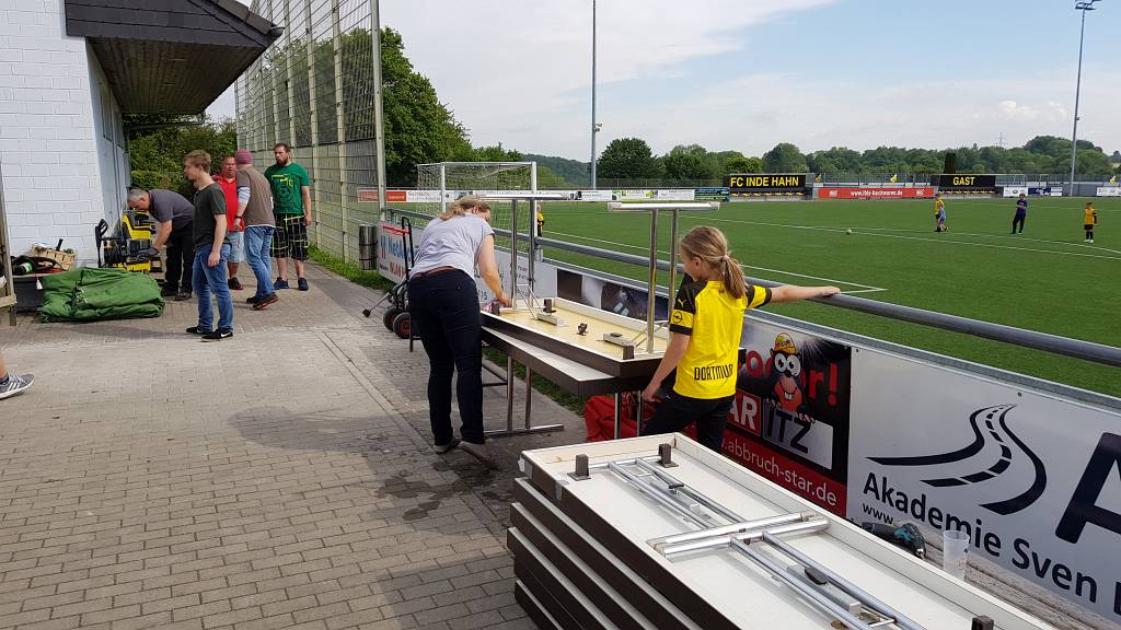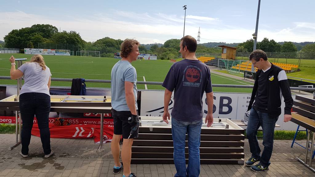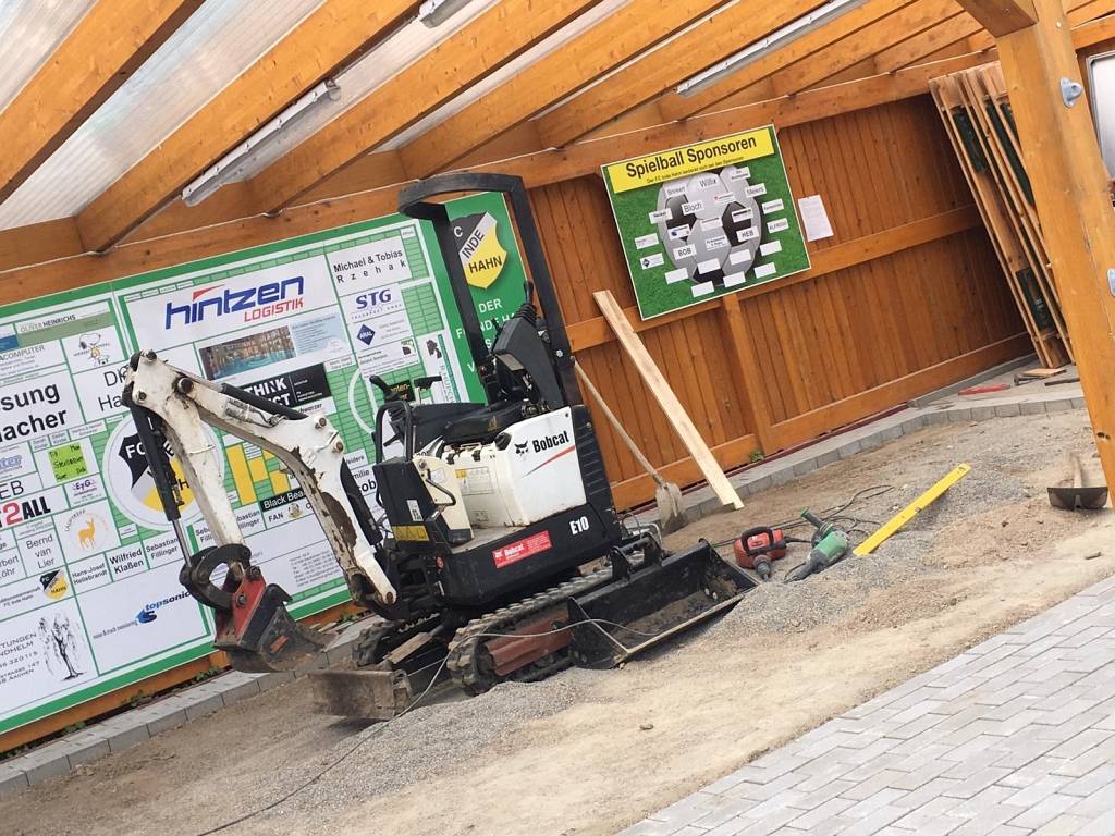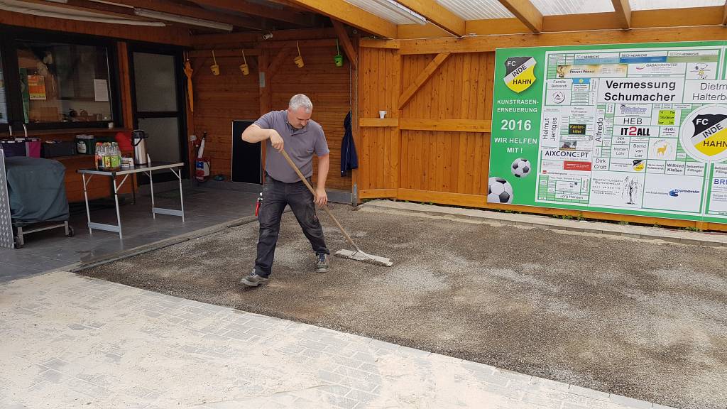 Am deutlichsten sichtbar sind die Änderungen im Bereich der Boulebahn, die um ein paar Quadratmeter verkleinert wurde, um dadurch die gepflasterte Fläche zu erweitern und Stolperfallen zu beseitigen. In diesem Bereich wurde einiges an Erde und Pflastersteinen bewegt. Das war aber nur eine der zahlreichen Verbesserungen und Aufräumaktionen – hier sind weitere Beispiele von der Auftragsliste, die am Samstag erledigt wurden: Zaun nachspannen und Löcher schließen, Sitzschalen reinigen und reparieren, herausgebrochene Stäbe im Fangzaun beseitigen, Neu-Ausrichtung der WebCams und Befestigung der Kabel, Altmetall und sonstigen Abfall einsammeln und abtransportieren, neue Mülleimer, neue schwarz/gelbe Tornetze, Anstrich- und Ausbesserungsarbeiten an der Sprecherkabine, Geländer befestigen, Gebäudeverkleidung und Pflastersteine mit Dampfstrahler grundreinigen, neue Abdeckung für die Boulebahn, alte Tische entsorgen, neue Tische grundreinigen und ins Vereinsheim bringen … und noch so einiges mehr. Werkzeug und Material war ausreichend vorhanden, helfende Hände ebenfalls und gute Laune sowieso. Die Damen vom Büdchen verwöhnten die Helfer gegen Mittag mit einer leckeren Mahlzeit und natürlich zwischendurch immer wieder mit Kaltgetränken. Auch das Wetter spielte hervorragend mit, so dass man in allen Bereichen gut voran kam.