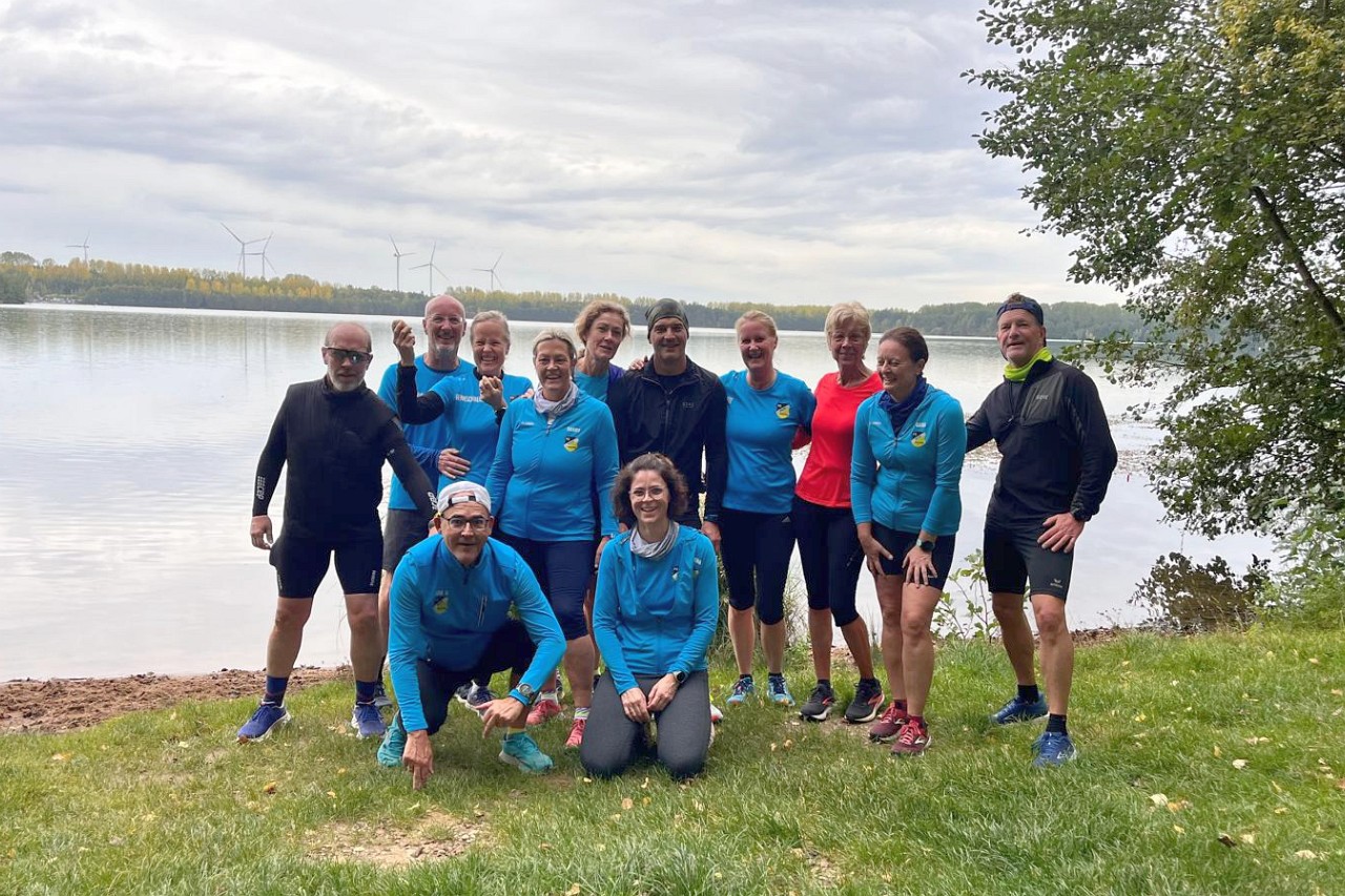 Blaue Shirts mit Vereinslogo und großem Kitz auf dem Rücken – so gekleidet treten unsere Hahner Läufer regelmäßig vor allem bei den Veranstaltungen des Regio Aachen Laufcups als gut gelaunte Laufgruppe an und versuchen dabei, neben dem Spaß an der Sache immer wieder gute Ergebnisse und Punktewertungen zu erzielen. Das war gestern ein wenig anders, denn für den Feiertag hatte man einen gemütlichen Ausflug an den Blausteinsee angesetzt. Nach einem intensiven Lauftraining auf dem Sportplatz am Montag, einem Trainingslauf mit vielen Höhenmetern am Mittwoch und bei vielen auch dem Fitnesstraining am Donnerstag wollte man die sportliche Woche mit einem Genuss- und Schwätzlauf am Freitag ausklingen lassen. Ralf Kniebeler, einer unserer Neuzugänge, hatte eine sehr flache Strecke in seiner Heimat am Blausteinsee ausgeguckt, auf der unsere Läufer gemütliche 11 km absolvierten und dabei wie immer richtig Spaß miteinander hatten, was man auf den folgenden Fotos sicher gut erkennen kann.
