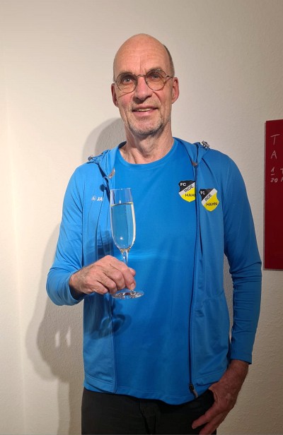 Kommen wir zur Hahner Bilanz für die Saison 2025 des Regio Aachen Laufcup … in einigen Altersklassen reichte es diesmal zu Podestplätzen: Sandy Laplume (Alterklasse W45), Eva Scheffler (W50) und Claus Uellendall (M60) erreichten Platz 3 ihrer Alterklassen-Wertungen, Bianka Uellendall (W50) und Dieter Lohr (M70) schafften es auf Platz 2 und Liselotte Bähr (W30) stand schließlich sogar ganz oben auf dem Siegertreppchen. Ein emotionaler Höhepunkt sollte zum Ende der Siegerehrung noch folgen, denn unser Laufteam konnte die Teamwertung zum zweiten Mal in Folge mit großem Vorsprung für sich entscheiden. 326 Punkte hatte unser Team gesammelt und damit die Verfolger vom Dürener TV (217 Punkte) und der SG Sparkasse Aachen (206 Punkte) deutlich hinter sich gelassen – ein beeindruckender Erfolg eines tollen Teams. Natürlich waren unsere Langstreckler auch an diesem Abend in ihren typischen blauen Laufdresses erschienen, denn das abschließende Siegerfoto gehörte wie immer zum Pflichtprogramm. Und selbst bei einigen Daheimgebliebenen wurde zur gleichen Zeit auf den Sieg angestoßen (s. Bild unten).