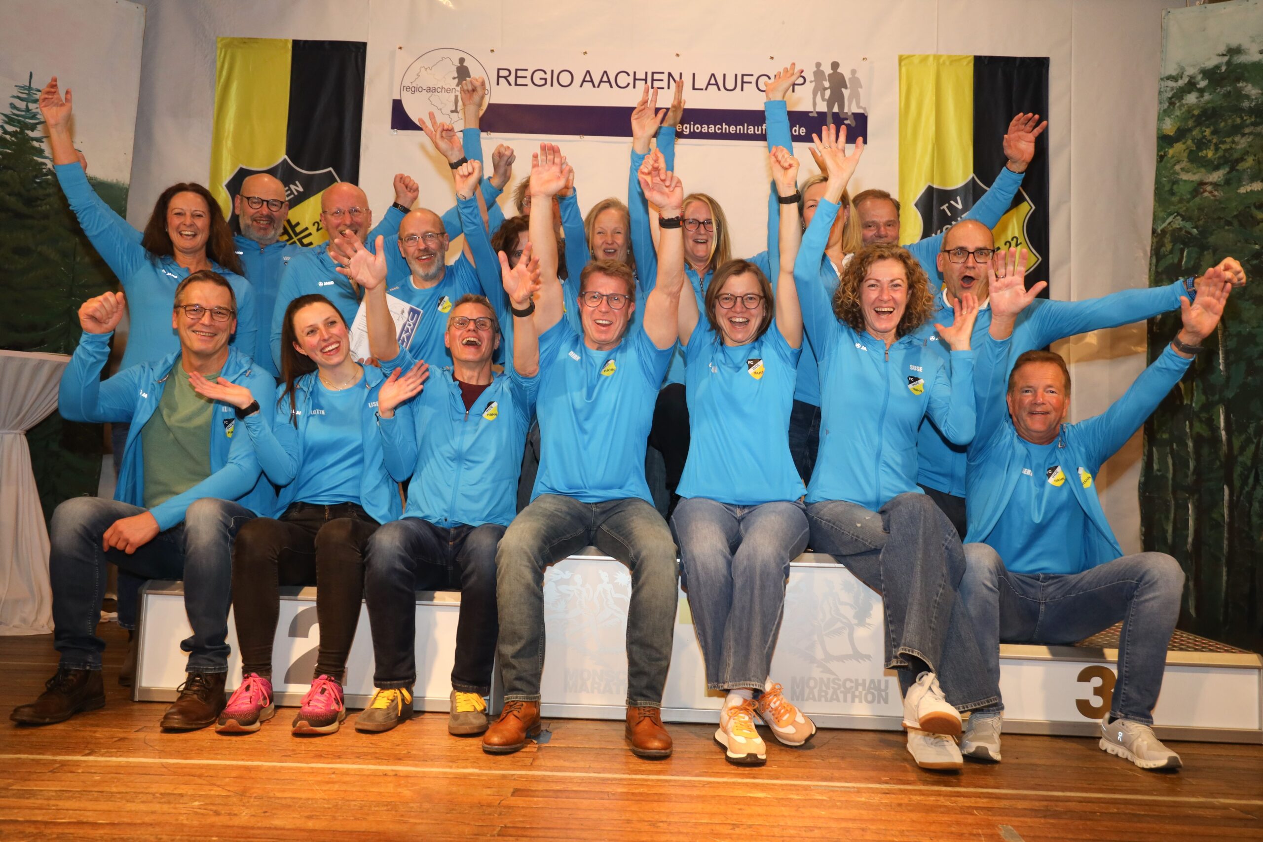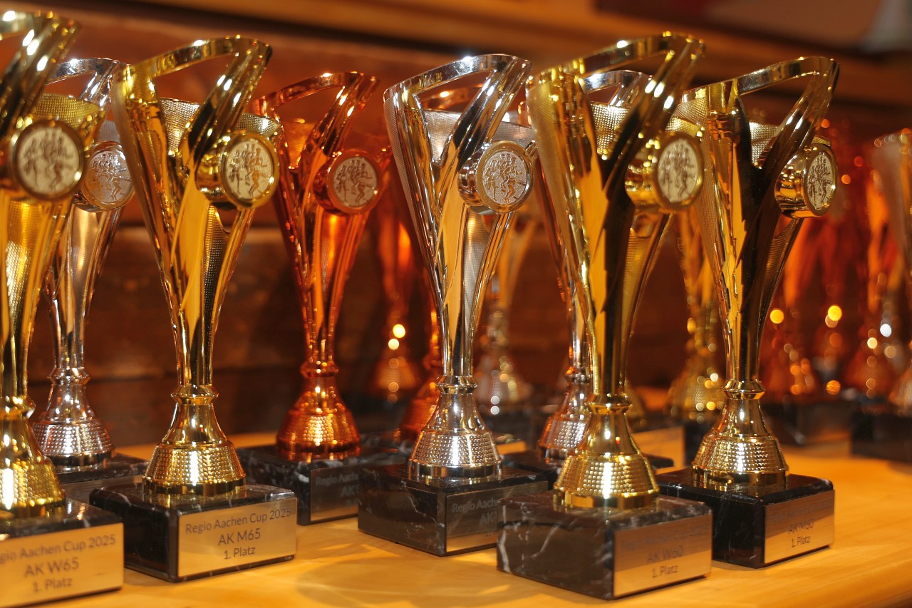 Der Januar gehört sportlich zu den eher ruhigen Monaten bei unseren Läufern. Dennoch findet man zur Monatsmitte ein echtes Highlight im Laufkalender: die Siegerehrung des Regio Aachen Laupfcup, bei der auch die Hahner Laufabteilung sowohl bei den Geehrten als auch im Publikum stark vertreten war. Die Veranstaltung fand am gestrigen Samstag in Konzen statt und war vom heimischen TV bestens organisiert. Bei Schnittchen und Getränken hatten sich insgesamt etwa 200 Cup-Teilnehmer im Saal eingefunden, um die Sieger der diversen Cup-Wertungen unserer lokalen Laufserie zu feiern, die übrigens mit 29 Veranstaltungen die vermutlich größte dieser Art in Deutschland ist. Die 20 Hahner Teilnehmer waren allerbester Laune, denn sie hatten an diesem Abend eine ganze Menge zu feiern. Die Ehrungen wurden überwiegend vom derzeit besten Läufer der Aachener Region vorgenommen: Frederik Ruppert, seit 2025 deutscher Rekordhalter und im vergangenen Jahr schnellster europäischer Läufer über 3000 Meter Hindernis, hatte es sich nicht nehmen lassen, den besten Cup-Läufern ihre Pokale zu überreichen und ihnen mit einem sportlichen Händedruck zu gratulieren.