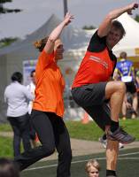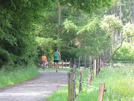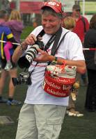 Das spiegelte sich insbesondere in der Ergebnisliste des Hauptlaufes über 10 Kilometer wider, denn vor allem bei den Männern wurden den zahlreichen Zuschauern phantastische Leistungen geboten. Nicht weniger als 21 der insgesamt 248 Läufer blieben unter der 40-Minuten -Marke, was angesichts des nicht ganz einfachen Streckenprofils bemerkenswert ist. Einer stellte aber alles in den Schatten: mit sagenhaften 32:29 verbesserte Jürgen Austin-Kerl vom PSV Grün-Weiß Kassel den alten Streckenrekord von Markus Breuer (der es locker nahm, wie man auf dem Foto rechts sieht) um satte zwei Minuten. Auch Tobias Hibbe von der ATG und Vorjahressieger Iwan Theunissen aus dem niederländischen Landgraaf unterboten deutlich die 35 Minuten und komplettierten damit das Siegertreppchen. Bei den Damen wurde nach vier Jahren ein neuer Name in die Siegerliste geschrieben: in Abwesenheit der Seriensiegerin Irmy Brandenburg siegte diesmal Florence Kostrzewa vom VfR Unterbruch mit einer Zeit von 42:49. Ihr folgten Tanja Watzlaw von DJK Elmar Kohlscheid und Angelika Dunke vom DLC Aachen, die vor 7 Jahren den allerersten Kitzenhaus-Lauf gewonnen hat und seitdem regelmäßig in Hahn dabei ist.