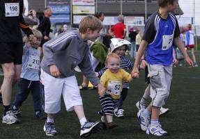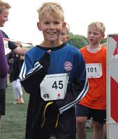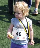Beim 1000-Meter-Kinderlauf ging es wie immer besonders heiß her. Die Zeiten der ersten 6 lagen ausnahmslos unter 4 Minuten – eine Geschwindigkeit, die auch für die meisten erwachsenen Läufer nur mit größter Anstrengung zu laufen ist. Unter diesen Top 6 waren jeweils drei Mädchen und drei Jungen, die demzufolge auch das Siegertreppchen besetzten. Schnellster war Per Christian Münstermann (Dürener TV) vor Olivier Fraipont, Michelle Jansen (LG Mützenich), Louisa Kleiber, Cedric Gerhardt (Jugendsport Wenau) und Nina Schlösser (Fortuna Beggendorf). Doch gerade beim Schülerlauf wie auch beim Bambinilauf sind eigentlich alle Sieger und das dokumentierten unsere Moderatoren Alfred und Michael auch gleich dadurch, dass sie die Kinder gemeinsam zum verdienten Applaus nach vorne holten. Der Bambinilauf war mit mehr als 60 kleinen Läufern wieder überaus beliebt und einen besonderen Applaus bekommen hier die Teilnehmer, die sich für die 300-Meter-Runde hinter dem Hasen Andrea am meisten Zeit nehmen und das oft an der Hand der Eltern und mit einem Kuscheltier unter dem Arm. Es macht einfach großen Spaß, diese jungen Lauftalente zu beobachten, wie sie am Ende mit dem verdienten Schokobrötchen oder Berliner in der Hand stolz ihre Medaillen präsentieren – hoffentlich inspiriert das einige von ihnen zu weiteren Läufen in der Zukunft.